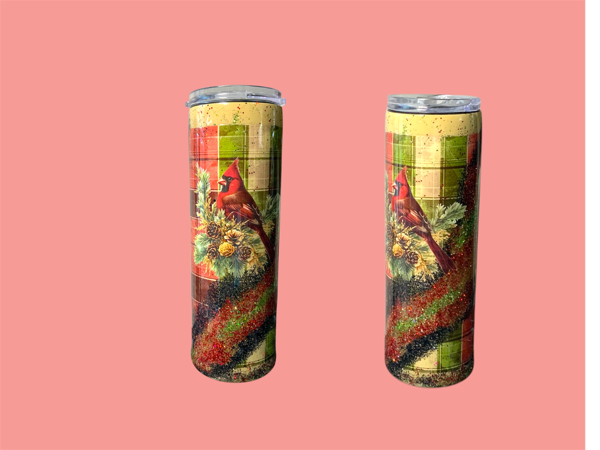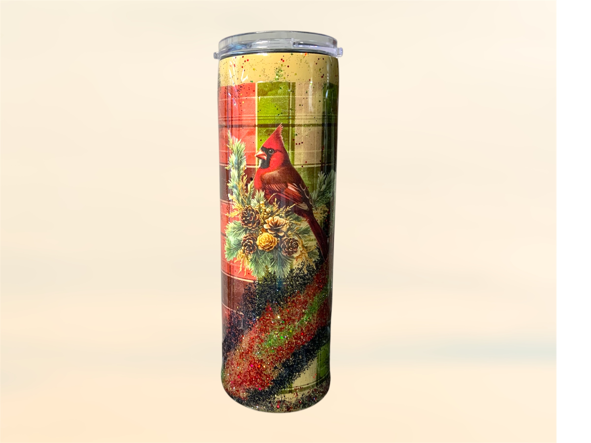 Look at this beauty. Red and green plaid vinyl, glitter and cardinal design!